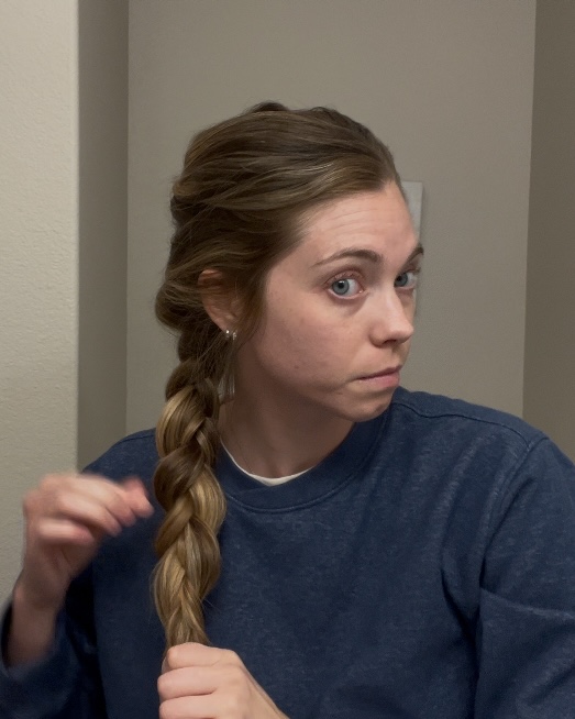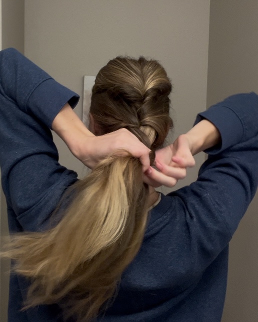 Start braiding a normal 3 strand braid all the way down. I start with the far right strand to cross over the middle section that holds the ponytail, then cross the left side over the new middle strand (that was the right section).